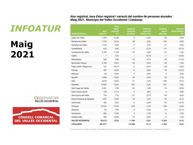 Pel que fa l'atur interanual, continua en clar descens, i el maig de 2021 va acabar amb 35 aturats menys que el mateix mes de l'any anterior, molt marcat encara per l'impacte directe de la COVID-19. Cal recordar que les persones en situació d'ERTO no comptabilitzen com a aturades a les dades oficials, segons ordre ministerial.